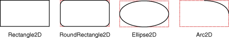 Rectangle2D,RoundRectangle2D,Arc2D, andEllipse2Dprimitives are all derived fromRectangularShape, which defines methods forShapeobjects that can be described by a rectangular bounding box--the geometry of aRectangularShapecan be extrapolated from a rectangle that completely encloses the outline of theShape:GeneralPath