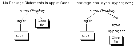 The Applet class defines convenient forms of image-loading and sound-loading methods that let you specify images and sounds relative to a base URL. For example, assume an applet is set up with one of the directory structures shown in the following figure.