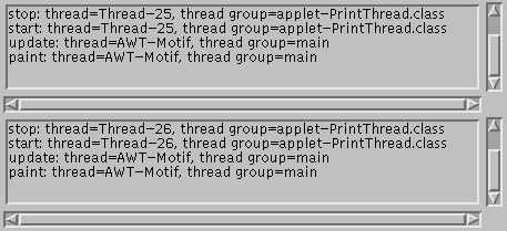 Below are two PrintThread applets. (Here's the code.) PrintThread calls repaint() unnecessarily every once in a while, so that you'll be able to see how its update() method gets called. You can't run applets. Here's what you'd see if you could: