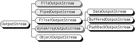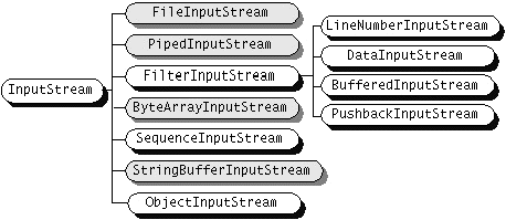 ReaderandWriter, subclasses ofInputStreamandOutputStreamprovide specialized I/O that falls into two categories: data sink streams and processing streams. Figure 56 shows the class hierarchies for the byte streams.As mentioned, two of the byte stream classes,ObjectInputStreamandObjectOutputStream, are used for object serialization. These classes are fully covered in Object Serialization.Understanding the I/O Superclasses
