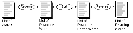 With pipe streams, the output from one method could be piped into the next, as shown in this figure:Next, we investigate a program that implements what's represented by the diagram in the previous figure. This program usesPipedReaderandPipedWriterto connect the input and output of itsreverseandsortmethods in order to create a list of rhyming words. Several classes make up this program. This section shows and discusses only the elements of the program that read from and write to the pipes. Follow the code links presented here to see the whole program.First, let's look at the calling sequence of the