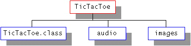 Let's look at an example. The JDKTM demos include a simple TicTacToe applet. This demo contains a bytecode class file, audio files, and images all housed in a directory called TicTacToe having this structure:The audio and images subdirectories contain sound files and GIF images used by the applet.To package this demo into a single JAR file named TicTacToe.jar, you would run this command from inside the TicTacToe directory: