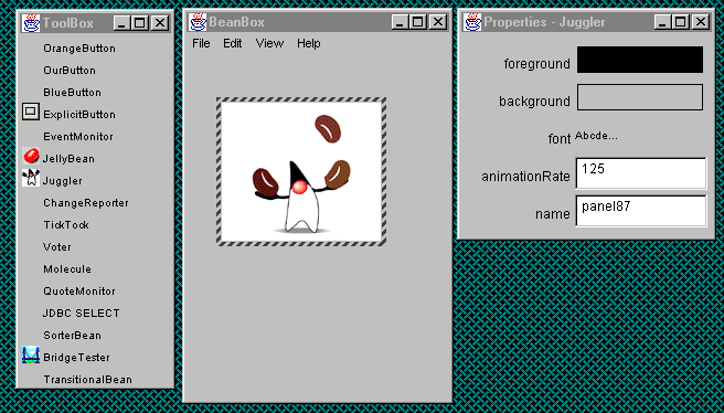 JugglerBean's properties. If you drop another Bean in the BeanBox window, the properties sheet will display that Bean's properties.Adding a Bean to the ToolBox