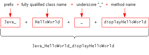 Java_, the package name, the class name, and the name of the native method. Between each name component is an underscore "_" separator. Graphically, this looks as follows:The native method