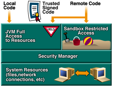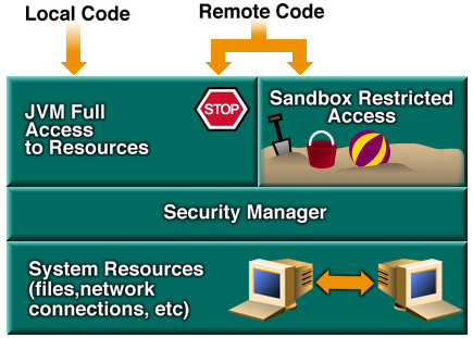 The original security model provided by the Java platform is known as the "sandbox" model, which existed in order to provide a very restricted environment in which to run untrusted code obtained from the open network. The essence of the sandbox model is that local code is trusted to have full access to vital system resources (such as the file system), while downloaded remote code (an applet) is not trusted and can access only the limited resources provided inside the sandbox. A security manager is responsible (in this and subsequent platforms) for determining which resource accesses are allowed.