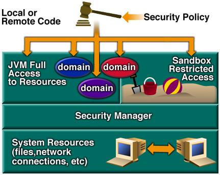 The new security architecture in JDK 1.2 is illustrated in the figure below. The arrow on the left end refers to a domain whose code is granted full access to resources, while the one on the right refers to the opposite extreme: a domain restricted exactly the same as the original sandbox. The domains in between have more accesses allowed than the sandbox, but less than full access.
