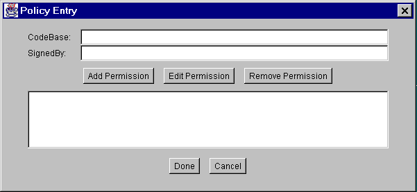 You are now done specifying this policy entry, so select the Done button in the "Policy Entry" dialog. The "Policy Tool" window now contains a line representing the policy entry, showing the SignedBy value: