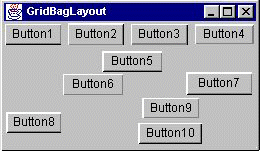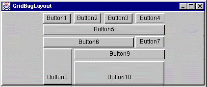 GridBagLayoutand the components it manages. (Here's the whole program. The program runs either within an applet, with the help ofAppletButton, or as an application.)private JPanel contentPane; ... protected void makebutton(String name, GridBagLayout gridbag, GridBagConstraints c) { JButton button = new JButton(name); gridbag.setConstraints(button, c); contentPane.add(button); } public GridBagWindow() { GridBagLayout gridbag = new GridBagLayout(); GridBagConstraints c = new GridBagConstraints(); contentPane = new JPanel(); contentPane.setFont(new Font("Helvetica", Font.PLAIN, 14)); contentPane.setLayout(gridbag); c.fill = GridBagConstraints.BOTH; c.weightx = 1.0; makebutton("Button1", gridbag, c); makebutton("Button2", gridbag, c); makebutton("Button3", gridbag, c); c.gridwidth = GridBagConstraints.REMAINDER; //end of row makebutton("Button4", gridbag, c); c.weightx = 0.0; //reset to the default makebutton("Button5", gridbag, c); //another row c.gridwidth = GridBagConstraints.RELATIVE; //next to last in row makebutton("Button6", gridbag, c); c.gridwidth = GridBagConstraints.REMAINDER; //end of row makebutton("Button7", gridbag, c); c.gridwidth = 1; //reset to the default c.gridheight = 2; c.weighty = 1.0; makebutton("Button8", gridbag, c); c.weighty = 0.0; //reset to the default c.gridwidth = GridBagConstraints.REMAINDER; //end of row c.gridheight = 1; //reset to the default makebutton("Button9", gridbag, c); makebutton("Button10", gridbag, c); setContentPane(contentPane); }This example uses one