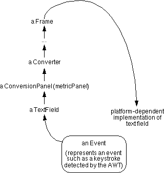 From a Component's view, the AWT event-handling system is more like an event-filtering system. Platform-dependent code generates an event, but Components get a chance to modify, react to, or intercept the event before the platform-dependent code fully processes the event. The following figure shows the chain of event handling for a TextField event in the example program.