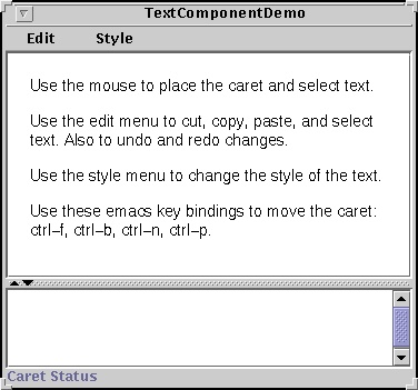 Note: The implementation of undo and redo inTextComponentDemowas copied directly from the NotePad demo that comes with Swing. Many programmers will also be able to copy this implementation of undo/redo without modification.