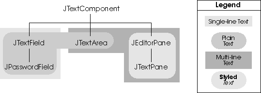 JTextComponentand its descendants implement Swing's editable text components. The following figure shows the text component hierarchy and groups the classes according to their capabilities: