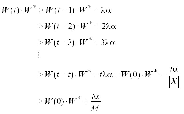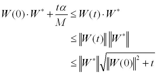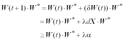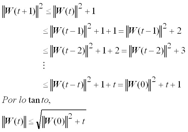 Esta última desigualdad establece una cota superior para el crecimiento del módulo del vector de pesos con las sucesivas correcciones de aprendizaje: