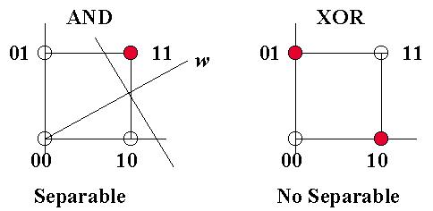 Un problema es linealmente separable, si en el espacio de patrones de entrada se puede encontrar un hiperplano (de dimensión m - 1) que separe los patrones de una clase (+1) de los de la otra clase (-1 ó 0).